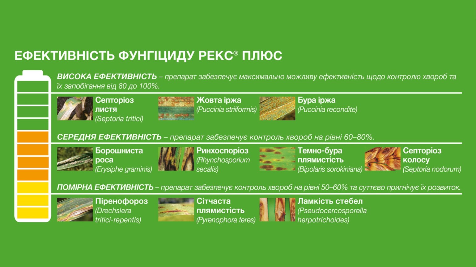 - Контролює широкий спектр хвороб, зокрема борошнисту росу, септоріоз листя, види іржі тощо